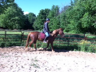 The next morning, Sunday, Ellen met me at the barn. After our chores, she decided to ride Dante in the indoor arena. The arena is a large and scary place compared to the round pen. She walked circles on the safe end. I urged her to trot, and she started trotting half circles. Finally, she trotted a full circle and had enough of that. It was time to go back to the round pen to get some real trotting in. There, they both did wonderfully.
